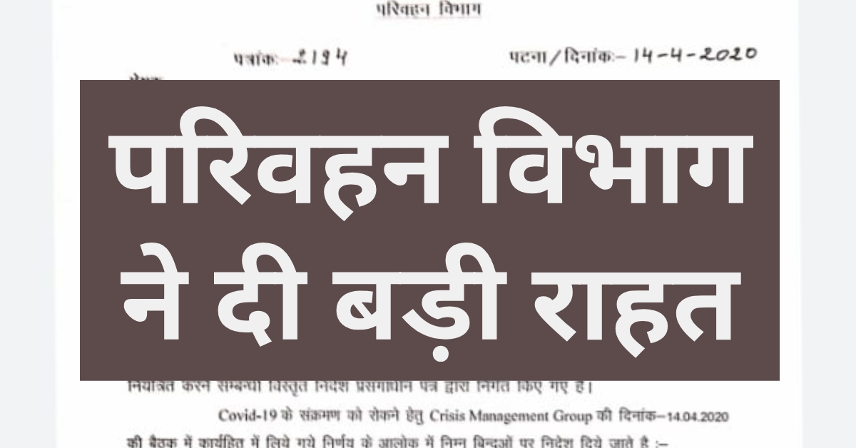 जनमित्र: कोरोना संक्रमण को फैलने से रोकने के लिए सोशल डिस्टेंसिंग एवं लॉक डाउन को 3 मई तक बढ़ा दिया गया है इसी बीच राज्य परिवहन विभाग के द्वारा कुछ राहत दी गई है पत्र जारी करते हुए परिवहन विभाग के सचिव ने बताया कि सरकारी कार्य हेतु प्रयोग में लाए जाने वाले अन्य वाहनों के लिए पास की आवश्यकता नहीं होगी पटना उच्च न्यायालय जिला व्यवहार न्यायालय केंद्र एवं राज्य सरकार के कार्यालयों केंद्र एवं राज्य सरकार के उपक्रमों बैंकों राज्य के विभिन्न बोर्ड निगम सोसाइटी विभिन्न आयोग के पदाधिकारी कार्यालय आने जाने हेतु अपने निजी वाहन दोपहिया चार पहिया का उपयोग कर सकते हैं बशर्ते कि उनके पास अपने कार्यालय का परिचय पत्र हो आवश्यक सेवाएं तथा विद्युत आपूर्ति टेलीकॉम
