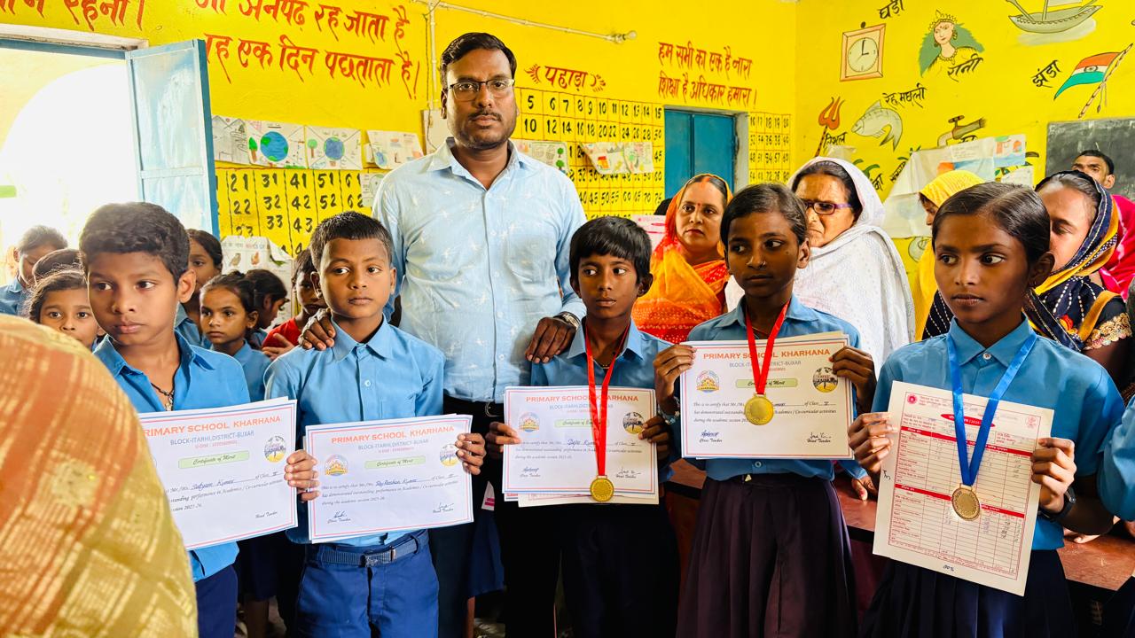 बिहार सरकार के निर्देशानुसार राज्य के सभी प्राथमिक एवं मध्य विद्यालयों में आज शिक्षक-अभिभावक संगोष्ठी का आयोजन किया गया। इसी क्रम में बक्सर जिले के इटाढी प्रखंड अंतर्गत प्राथमिक विद्यालय खरहना में भी वार्षिक परीक्षा के उपरांत बच्चों के प्रगति पत्रक वितरण कार्यक्रम सफलतापूर्वक संपन्न हुआ। कार्यक्रम के दौरान न केवल बच्चों को उनकी वार्षिक उपलब्धियों का प्रमाण-पत्र सौंपा गया, बल्कि उन्हें प्रोत्साहित करने के लिए विभिन्न कक्षाओं के अव्वल विद्यार्थियों को प्रशस्ति पत्र व मेडल देकर सम्मानित भी किया गया।