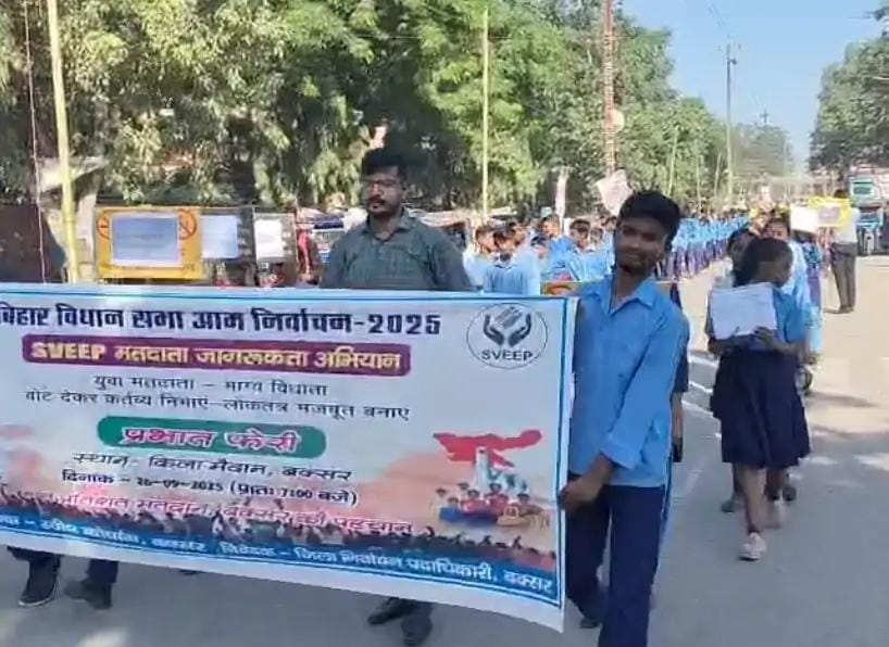 आगामी चुनावों को लेकर बक्सर जिले में स्वीप (सिस्टेमैटिक वोटर्स एजुकेशन एंड इलेक्टोरल पार्टिसिपेशन) कार्यक्रम के तहत मतदाता जागरूकता अभियान तेजी से चल रहा है। गुरुवार को विभिन्न स्कूलों के छात्र-छात्राओं ने शहर के मुख्य मार्गों पर प्रभात फेरी निकालकर लोगों को मतदान के महत्व के प्रति जागरूक किया। सफेद वेशभूषा में सजे बच्चों ने हाथों में बैनर और तख्तियां थामे ‘वोट फॉर इंडिया’ और ‘पहले मतदान, फिर जलपान’ जैसे नारे लगाए, जिसने राहगीरों का ध्यान खींचा।